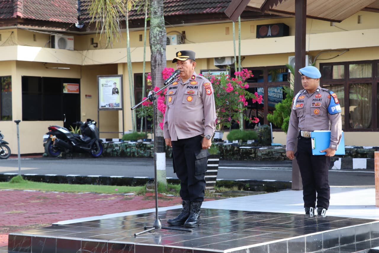 PINRANG : Wakapolres Pinrang KOMPOL Muh. Yusuf Badu, S.H., memimpin apel pagi jam pimpinan yang diikuti oleh personel Polres Pinrang bersama siswa Latihan Kerja (Latja) SPN Batua Polda Sulawesi Selatan bertempat di Mapolres Pinrang, Senin (27/04/2026) pagi.