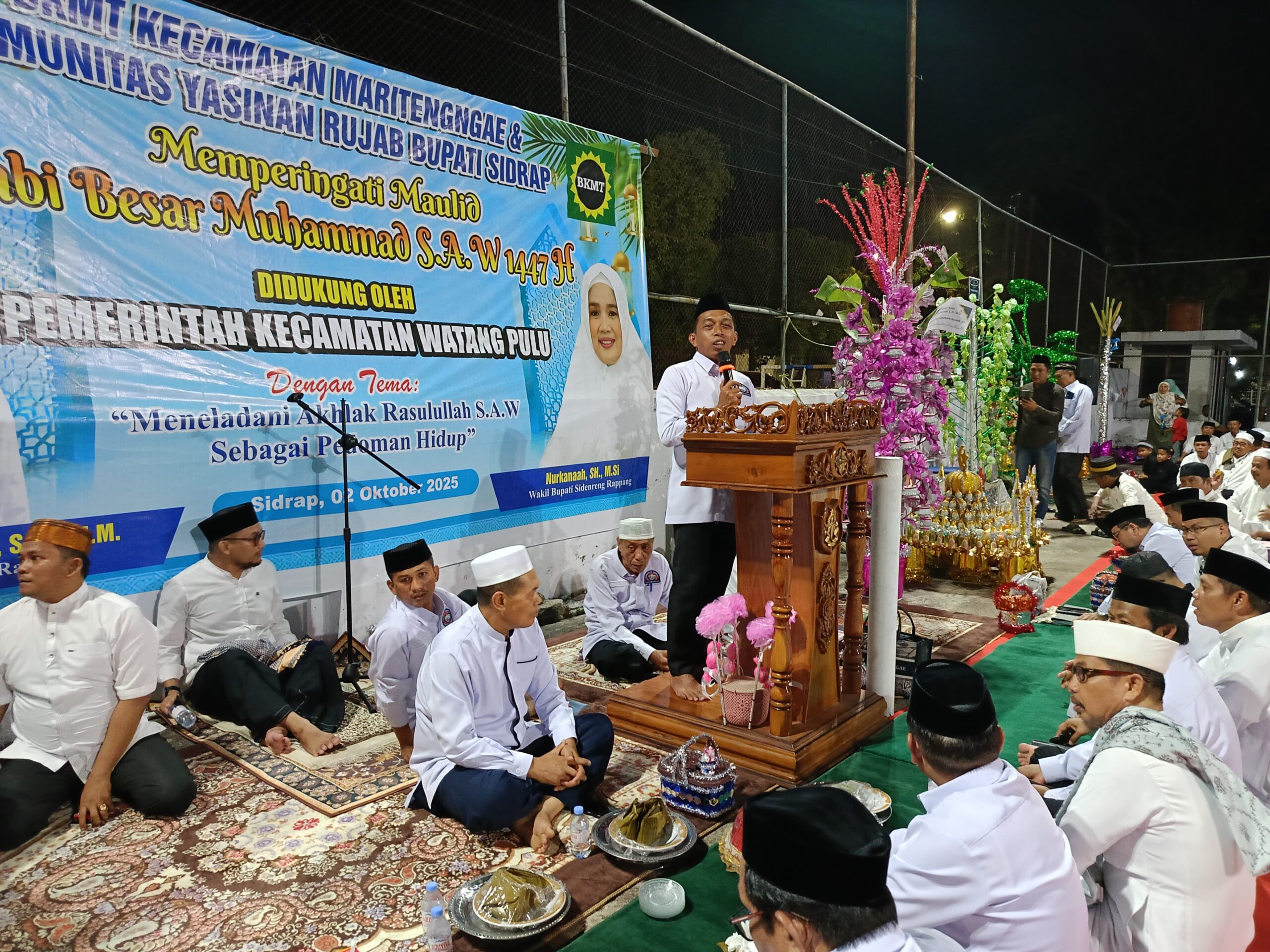 SIDRAP : Bupati Sidrap, H. Syaharuddin Alrif, mengajak seluruh masyarakat untuk meneladani akhlak mulia Rasulullah SAW dalam kehidupan sehari-hari.