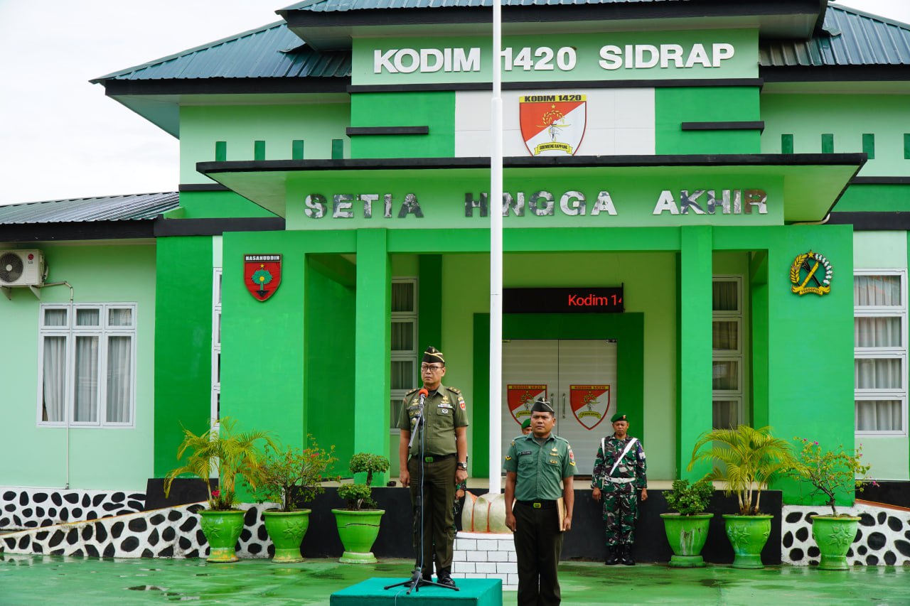 SIDRAP : Mayor Inf Wahyudi, S.E. selaku Kasdim 1420/Sidrap secara langsung memimpin pelaksanaan Upacara Pengibaran Bendera Minggu Ke-VI Bulan Desember 2025 yang diadakan di Lapangan Upacara Makodim 1420/Sidrap, Jalan Jenderal Sudirman, Kelurahan Majelling Wattang, Kecamatan Maritengngae, Kabupaten Sidrap, pada hari Senin (22/12/2025).