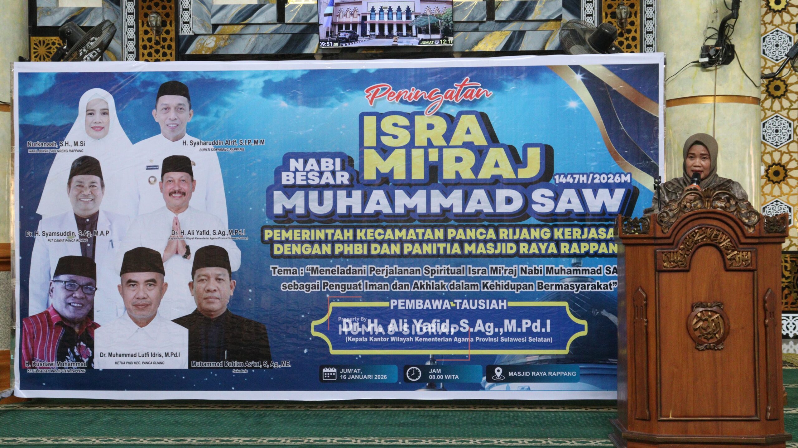 SIDRAP : Wakil Bupati Sidrap Nurkanaah, menghadiri peringatan Isra Mi’raj Nabi Muhammad SAW 1447 Hijriah yang digelar Pemerintah Kecamatan Panca Rijang bersama Panitia Hari Besar Islam (PHBI) di Masjid Raya Rappang, Jumat (16/1/2026).